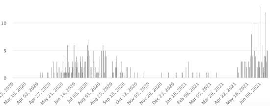 According to the Ministry of Public Health, 192 new cases and 5 deaths in 24 hours (3 Dept. West: 2 in the North) of Covid-19 have been confirmed in Haiti as of 19 June 2021 (latest partial data available) for a total of 17,902 cases and 398 deaths since the start of the pandemic. 3rd wave : As of June 17, 2021 the total of the 3rd wave (beginning of May 10, 2021) amounts to 4,531 confirmed cases (+ 4.2%) and 134 deaths (+ 3.8%). For reference in April 2021 before the start of the 3rd wave of Covid the toll for the month was 267 new cases and 9 deaths. Cases confirmed by department : West: 12,794 (+106) North: 1.019 (+2) Center: 912 Artibonite: 864 (+35) North-East: 516 (+17) South-East: 415 (+1) South: 462 (+2) North-West: 327 (+6) Grand'Anse: 391 (+20) Nippes: 202 (+3) Situation 2021 : In the Department of the West, the main affected communes are : Delmas 1,564 cases (+28), Petion ville 1,407 cases (+18), Port-au-Prince 840 cases (+23 ), Tabarre 670 cases (+6), Croix-des-Bouquets 608 cases (+9) and Carrefour 335 cases (+10) Haiti : Number of active cases since the start of the pandemic (less deaths and recoveries) :