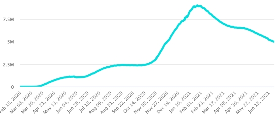 Vaccination: 2.79 billion doses of vaccine injected (+40 million doses injected in 24 hours updated June 23, 2021 latest data available). 1 TOP 5 countries with the most active cases: (less deaths and recoveries) 1st - USA: 4,984,406 cases, (-15,388 in 24 hours), the day before (-35,074) 2nd * - Brazil: 1,179,903 cases (+17,008 in 24 hours), the day before (-15,702) 3rd * - India: 627,024 cases (-16,139 in 24 hours), the day before (-19,358) 4th * - Russia 341,617 cases (+6,109 in 48 hours), the day before (+4,386) 5th * - Argentina 290,792 cases (+10,680 in 24 hours), the day before (+3,042) TOP 5 countries with the most deaths: 1st - USA: 618,294 deaths (+419 in 24 hours), the day before (+412) 2nd * - Brazil: 507,240 deaths (+2,343 in 24 hours), the day before (+2,080) 3rd * - India: 392,014 deaths (+1.323 in 24 hours), the day before (+1.389) 4th * - Mexico: 231,847 deaths (+342 in 24 hours), the day before (+261) 5th * - Peru: 191,073 deaths (+167 in 24 hours), the day before (+261) TOP 5 countries with the highest number of healings: 1st * - India: 29,063,740 healings (+68,885 in 24h), cure rate 96.61% (+) 2nd - USA: 28,846,304 healings (+29,170 in 24 hours), cure rate 83.73% (+) 3rd * - Brazil: 16,483,635 healings (+94,788 in 24h), cure rate 90.71% (-) 4th * - France: 5,583,247 healings (+8,110 in 24 hours), cure rate 96.89% (+) 5th * - Turkey: 5,248,862 healings (+5,917 in 24h), cure rate 97.42% (=) DIASPORA: United States: * Case since the first case (March 9, 2020): 34,449,004 cases (+14,201 in 24 hours), the day before (+14,965) * Healings: 28,846,304 healings (+29,170 in 24 hours), the day before (+49,627) National Healing Rate: 83.73% (+) * Death: 618,294 deaths (+419 in 24 hours), the day before (+412) * Active cases (less deaths and recoveries): 4,984,406 cases, (-15,388 in 24 hours), the day before (-35,074) Canada: * Cases since the start of the epidemic (January 25, 2020): 1,410,927 cases (+721 in 24 hours), the day before (+599) * Healings: 1,375,107 people (+1,218 in 24 hours, the day before (+1,398) National Healing Rate: 97.46% (+) * Death: 26,175 deaths (+20 in 24 hours), the day before (+71) National death rate: 1.85% (=) * Active cases: (excluding death and cures) 9,645 (-517 in 24 hours), the day before (-870) * Tests: 36,344,745 people tested since the first case. Vaccination: 33.59 million doses of vaccine injected since December 14, 2020, date of the first injection in Canada (+520,000 doses injected in 48 hours updated June 23, 2021 latest data available). Canada: Number of active cases since the start of the pandemic (less deaths and recoveries)