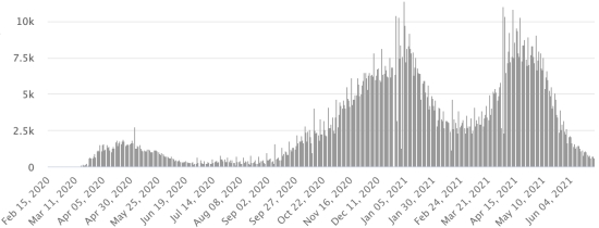 Vaccination: 2.84 billion doses of vaccine injected (+50 million doses injected in 24 hours updated June 24, 2021 latest data available). 1 TOP 5 countries with the most active cases: (less deaths and recoveries) 1st - USA: 4,966,060 cases, (-8,297 in 24 hours), the day before (-10,049) 2nd * - Brazil: 1,263,329 cases (+40,829 in 24 hours), the day before (+42,597) 3rd * - India: 595,534 cases (-17,306 in 24 hours), the day before (-14,184) 4th * - Russia 347,385 cases (unavailable), the day before (+5,768) 5th * - Argentina 292,319 cases (+826 in 24 hours), the day before (+7,010) TOP 5 countries with the most deaths: 1st - USA: 619,152 deaths (+467 in 24 hours), the day before (+391) 2nd * - Brazil: 511,272 deaths (+1,990 in 24 hours), the day before (+2,042) 3rd * - India: 394,524 deaths (+1,186 in 24 hours), the day before (+1,324) 4th * - Mexico: 232,346 deaths (+278 in 24 hours), the day before (+221) 5th * - Peru: 191,447 deaths (+161 in 24 hours), the day before (+213) TOP 5 countries with the highest number of healings: 1st * - India: 29,193,085 healings (+64,818 in 24 hours), cure rate 96.71% (+) 2nd - USA: 28,897,460 healings (+25,546 in 24h), cure rate 83.80% (+) 3rd * - Brazil: 16,548,159 healings (+36,458 in 24h), cure rate 90.31% (-) 4th * - France: 5,596,777 healings (+6,610 in 24 hours), cure rate 97.05% (+) 5th * - Turkey: 5,261,892 healings (+7,184 in 24 hours), cure rate 97.46% (+) DIASPORA: United States: * Case since the first case (March 9, 2020): 34,482,672 cases (+17,716 in 24 hours), the day before (+15,952) * Healings: 28,897,460 healings (+25,546 in 24 hours), the day before (+25,610) National Healing Rate: 83.80% (+) * Death: 619,152 deaths (+467 in 24 hours), the day before (+391) * Active cases (less deaths and recoveries): 4,966,060 cases, (-8,297 in 24 hours), the day before (-10,049) Canada: * Cases since the start of the epidemic (January 25, 2020): 1,412,226 cases (+592 in 24 hours), the day before (+707) * Healings: 1,376,904 people (+810 in 24 hours, the day before (+987) National Healing Rate: 97.49% (+) * Death: 26,197 deaths (+6 in 24 hours), the day before (+16) National death rate: 1.85% (=) * Active cases: (excluding death and recovery) 9.125 (-224 in 24 hours), the day before (+296) * Tests: 36,484,663 people tested since the first case. Vaccination: 34.17 million doses of vaccine injected since December 14, 2020, date of the first injection in Canada (+580,000 doses injected in 24 hours updated June 24, 2021 latest data available). Canada: Number of daily confirmed cases: