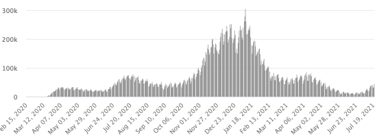 Most affected municipalities in the West (2021): Delmas: 1.795 (+12); Pétion ville 1,588 (+5); Port-au-Prince 985 (+2); Tabarre 773 (+7); Croix-des-Bouquets 715 (+4); Carrefour 361 (+0) Cases tested since the start of the pandemic: 95,866 cases (+267 in 24 hours, update July 11, 2021 (latest data available). Note that the very low number of people tested does not statistically allow us to do so. a representative estimate of Covid-19 cases in Haiti. Confirmed cases by department (2021): West: 6.753 (2020: 6.945) North: 426 (2020: 677) Center: 521 (2020: 508) Artibonite: 428 (2020: 593) Northeast: 229 (2020: 314) Southeast: 233 (2020: 274) South: 371 (2020: 262) Northwest: 141 (2020: 229) Grand'Anse: 301 (2020: 176) Nippes: 97 (2020: 149) Cumulative deaths by department (2021): West: 168 (2020: 104) North: 28 (2020: 34) Center: 15 (2020: 13) Artibonite: 10 (2020: 39) Northeast: 3 (2020: 6) South: 25 (2020: 6) Southeast: 7 (2020: 9) Northwest: 5 (2020: 12) Grand'Anse: 1 (2020: 13) Nippes: 10 (2020: 5) Distribution of deaths by age (2020 and 2021): 0-9 years: 12 10-19 years: 6 20-29 years: 20 30-39 years: 31 40-49 years: 55 50-59 years: 91 60-69 years: 107 70-79 years: 112 (+1) 80 years and over: 78 Vaccination: 38 doses injected on Friday, July 16 https://www.haitilibre.com/en/news-34253-haiti-covid-first-injections-of-vaccines.html . Last data available. DIASPORA: Epidemiological situation: USA: * Case since the first case (March 9, 2020): 35,081,719 cases (+63,119 in 24 hours), the day before (+54,693) * Healings: 29,435,171 healings (+28,969 in 24 hours), the day before (+29,612) National Healing Rate: 83.90% (-) * Death: 625,363 deaths (+380 in 24 hours), the day before (+237) National death rate: 1.78% (=) * Active cases (less deaths and recoveries): 5,021,185 cases, (+33,770 in 24 hours), the day before (+24,844) * Tests: 518,658,231 people tested since the first case. USA: Number of daily confirmed cases: