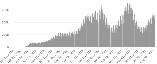 WORLD SITUATION: Epidemiological situation: Tuesday, August 10, 2021 the number of people infected worldwide with the Covid-19 coronavirus since the start of the pandemic (Official source), amounted to 204,211,186 cases (+702,333 in 24 hours), the standby (+ 451,532) Number of contaminated countries: 192 * Healings: 183,395,005 people were cured of Covid-19 worldwide (+579,987 in 24 hours), the day before (+410,573) * Deaths: 4,317,457 people died from Covid-19 around the world (+8,913 in 24 hours), the day before (+7,362) * Active cases (less deaths and recoveries) in the world is currently 16,498,724 cases (+113,433 in 24 hours), the day before (+33,597) Average cure rate in the world: 89.80% (-) Average death rate in the world: 2.11% (=) World: Number of daily confirmed cases: