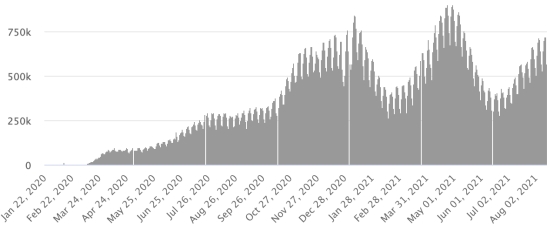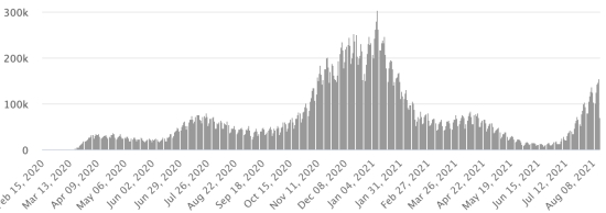 WORLD SITUATION: Epidemiological situation: Sunday, August 15, 2021 the number of people infected worldwide by the Covid-19 coronavirus since the start of the pandemic (Official source), amounts to 207,584,240 cases (+539,780 in 24 hours), the standby (+726,692) Number of contaminated countries: 192 * Healings: 186,071,552 people were cured of Covid-19 worldwide (+422,334 in 24 hours), the day before (+503,868) * Deaths: 4,368,519 people died from Covid-19 around the world (+8,814 in 24 hours), the day before (+10,212) * Active cases (less deaths and recoveries) in the world is currently 17,144,169 cases (+108,632 in 24 hours), the day before (+212,612) Average cure rate in the world: 89.63% (-) Average death rate in the world: 2.10% (=) World: Number of daily confirmed cases: