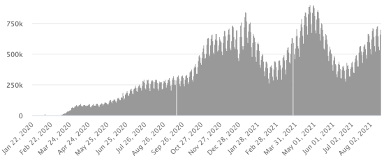 WORLD SITUATION: Epidemiological situation: Thursday August 19, 2021 the number of people infected worldwide by the Covid-19 coronavirus since the start of the pandemic (Official source), amounts to 210,206,855 cases (+780,831 in 24 hours), the day before (+652,754) Number of contaminated countries: 192 * Healings: 188,303,077 people were cured of Covid-19 worldwide (+596,695 in 24 hours), the day before (+550,010) * Deaths: 4,407,133 people died of Covid-19 worldwide (+11,795 in 24 hours), the day before (+10,349) * Active cases (less deaths and recoveries) in the world is currently 17,496,645 cases (+172,341 in 24 hours), the day before (+92,395) Average cure rate in the world: 89.57% (-) Average death rate in the world: 2.09% (=) World: Number of daily confirmed cases: