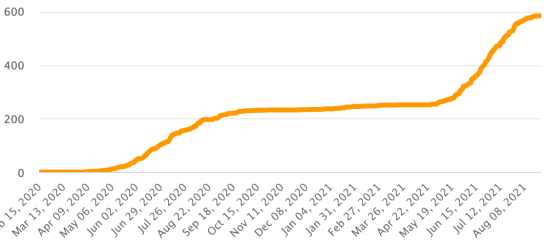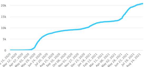 Vaccination: 5.13 billion doses of vaccine injected (+50 million doses injected in 24 hours updated August 26, 2021 latest data available). HAITI: Epidemiological situation: According to the Ministry of Public Health, +12 new cases in 24 hours of Covid-19 and its variants were confirmed in Haiti on August 20, 2021 (latest partial data available ) for a total of 20,845 cases confirmed throughout the national territory (46.2% of women and 53.8% of men), since the first case (March 19, 2020 https://www.haitilibre.com/en/news-30319-haiti-health-origin-of-the-first-2-cases-of-covid-19-in-haiti.html). Previous update (+72 cases on August 17/18 and 19). 3rd wave: The total for the 3rd wave (beginning of May 10, 2021) stands at 7,539 confirmed cases and 313 deaths. . Update August 20, 2021. Healings: 17,563 (+0 in 24h) Healing rate: 84.25% (-) Deaths: 584 deaths +0 () Mortality rate: 2.80% (=) Haiti: Trend in deaths: