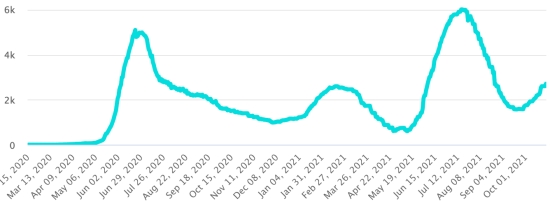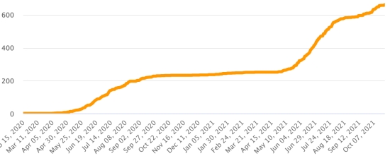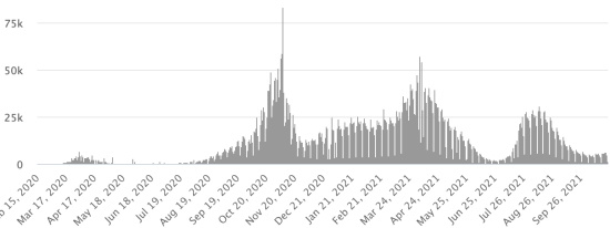 The total of the 3rd wave (beginning of September 20, 2021) amounts to 2,036 confirmed cases (+213) and 52 deaths (+4 in 4 days). Updated October 19, 2021.