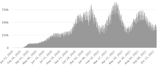 WORLD SITUATION: Epidemiological situation: On Wednesday, October 27, 2021 the number of people infected worldwide with the Covid-19 coronavirus since the start of the pandemic (Official source), amounts to 245,345,217 cases (+465,913 in 24 hours), the standby (+410,536) Number of contaminated countries: 221 * Healings: 222,419,739 people were cured of Covid-19 worldwide (+415,847 in 24 hours) the day before (+508,620) * Deaths: 4,980,034 people died from Covid-19 worldwide (+8,643 in 24 hours), the day before (+6,874) * Active cases (less deaths and recoveries) in the world is currently 17,945,444 cases (+41,423 in 24 hours), the day before (+104,958) Average cure rate in the world: 90.65% (=) Average death rate in the world: 2.02% (-) World: Number of daily confirmed cases: