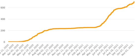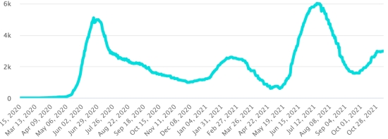 Vaccination: 7.34 billion doses of vaccine injected (+30 million doses injected in 24 hours. Update November 9, 2021 (latest data available). HAITI: Epidemiological situation: Warning : The Ministry of Public Health and Population (MSPP) did not make available daily data on the Covid-19 situation in Haiti after November 3, 2021. Accordingly, the data below on the situation in Haiti is the latest available. According to the Ministry of Public Health, +123 new cases within 48 hours of Covid-19 and its variants were confirmed in Haiti on November 2 and 3, 2021 (latest data partial available) for a total of 24,233 cases confirmed throughout the national territory (47.1% women and 52.9% men), since the first case (March 19, 2020 https://www.haitilibre.com/en/news-30319-haiti-health-origin-of-the-first-2-cases-of-covid-19-in-haiti.html ). Previous update (+48 cases on October 31 and November 1). Healings: 20,551 (+45 in 48h) Healing rate: 84.80% (-) Deaths: 702 deaths +10 in 48 hours (West +6, Center +1, Artibonite +3) Death rate: 2.85% (-) Haiti: Trend in deaths: