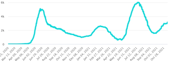 4th wave: The total of the 4th wave (beginning of September 20, 2021) amounts to 2,902 confirmed cases and 98 deaths . Cases tested since the start of the pandemic: 135,079 cases (+400 in 24 hours) latest data available. Note that the very low number of people tested does not statistically make it possible to make a representative estimate of the active cases of Covid-19 in Haiti. This also explains the low number of cases detected daily. By comparison, the neighboring Republic has carried out more than 2.3 million tests on its population since the start of the epidemic. TOP 5 most affected municipalities in the West (2021): Delmas: 2.493 (+30); Pétion ville 1,914 (+8); Port-au-Prince 1,340 (+4); Tabarre 1.098 (+20); Croix-des-Bouquets 1,756 (+23) Confirmed cases by department (2021): West: 9,187 cases (2020: 6,945 cases) North: 629 cases (2020: 677 cases) Center: 860 cases (2020: 508 cases) Artibonitis: 751 cases (2020: 593 cases) Northeast: 353 cases (2020: 314 cases) Southeast: 595 cases (2020: 274 cases) South: 663 cases (2020: 262 cases) Northwest: 331 cases (2020: 229 cases) Grand'Anse: 775 cases (2020: 176 cases) Nippes: 214 cases (2020: 149 cases) Cumulative deaths by department (2021): West: 237 deaths (2020: 104 deaths) North: 48 deaths (2020: 34 deaths) Center: 40 deaths (2020: 13 deaths) Artibonitis: 33 deaths (2020: 39 deaths) Northeast: 6 deaths (2020: 6 deaths) South: 44 deaths (2020: 6 deaths) Southeast: 13 deaths (2020: 9 deaths) Northwest: 15 deaths (2020: 12 deaths) Grand'Anse: 7 deaths (2020: 13 deaths) Nippes: 24 deaths (2020: 5 deaths) Distribution of deaths by age (since the start of the epidemic): 0-9 years: 13 deaths 10-19 years: 6 deaths 20-29 years: 25 deaths 30-39 years: 45 deaths 40-49 years: 73 deaths 50-59 years: 115 deaths (+1) 60-69 years: 161 deaths 70-79 years: 158 deaths (+1) 80 years and over: 112 deaths (+1) Vaccination: 135,256 (+12,095 in 6 days) doses of “Spikevax” vaccine (official name) from October 20, Laboratoire MODERNA have been injected in total in Haiti since July 16, 2021, date of the first injection. 39,676 people are fully vaccinated (2 doses). Update 31 October 2021, latest data available. List of 149 vaccination centers open in Haiti (and hours) by department: (update 20 October 2021) DIASPORA: Epidemiological situation: USA: * Case since the first case (March 9, 2020): 47,834,810 cases (+141,294 in 24 hours), the day before (+45,771) * Healings: 37,846,305 healings (+116,816 in 24 hours), the day before (+27,724) National Healing Rate: 79.11% (+) * Death: 782,933 deaths (+2,158 in 24 hours), the day before (+539) National mortality rate : 1.63% (=) * Active cases (less deaths and recoveries): 9,205,572 cases (+22,320), the day before (+17,508) * Tests: 719,087,944 people tested since the first case USA: Number of daily confirmed cases:
