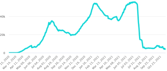 Vaccination: 437.35 million doses of vaccine injected since December 14, 2020, date of the first injection in the United States (2.86 million doses injected in 48 hours). Update 11 November 2021 (last available data). DOMINICAN REPUBLIC: Cases confirmed since March 1, 2020: 393,383 cases (+1,160 in 24 hours) the day before (+1,119). First case (March 1, 2020) https://www.haitilibre.com/en/news-30165-haiti-flash-first-case-of-covid-19-in-the-dominican-republic.html Healings: 385,107 healings since March 1 (+927 in 24 hours), the day before (+1,279) National Healing Rate: 97.89% (-) Death: 4,165 deaths (+7 in 24 hours), the day before (+1) Death rate: 1.05% (=) Positivity rate over 4 epidemiological weeks: 11.48% (=) Active cases: (excluding death and cures) 4,111 cases (-226 in 24 hours) the day before (-161) TOP 5 provinces with the most new cases in the last 24 hours: Santiago: +197 cases (+) Santo Domingo: +190 cases (-) District Nacional: +168 cases (-) Santiago Rodriguez: +51 cases La Romana: +49 cases Dominican Republic: Trend of active cases: (less healings and deaths)