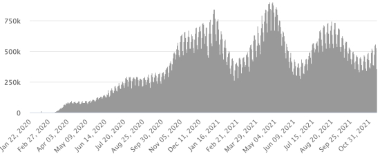 Vaccination: 7.51 billion doses of vaccine injected (+30 million doses injected in 24 hours. Update November 14, 2021 (latest data available). HAITI: Epidemiological situation: According to the Ministry of Public Health, +56 new cases in 24 hours of Covid-19 and its variants were confirmed in Haiti on November 9, 2021 (latest partial data available ) for a total of 24,599 cases confirmed throughout the national territory (47.1% of women and 52.9% of men), since the first case (March 19, 2020 https://www.haitilibre.com/en/news-30319-haiti-health-origin-of-the-first-2-cases-of-covid-19-in-haiti.html). Previous update (+58 cases on November 8). Healings: 20,675 (+0 in 24h) Healing rate: 84.04% (-) Deaths: 708 +0 deaths in 24 hours () Death rate: 2.87% (-) Haiti: Trend in deaths: