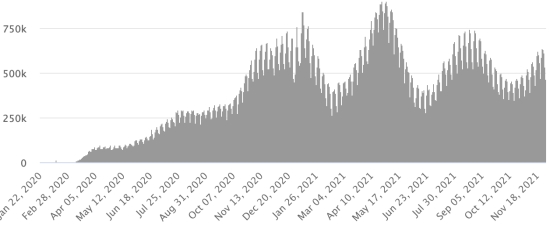 WORLD SITUATION: Epidemiological situation: Tuesday, November 30, 2021 the number of people infected worldwide by the Covid-19 coronavirus since the start of the pandemic (Official source), amounted to 262,504,601 cases (+694,566 in 24 hours), the standby (+409,408) Number of contaminated countries: 221 * Healings: 237,074,771 people were cured of Covid-19 worldwide (+606,390 in 24 hours) the day before (+340,455) * Deaths: 5,227,126 people died from Covid-19 around the world (+8,752 in 24 hours), the day before (+4,653) * Active cases (less deaths and recoveries) in the world is currently 20,202,704 cases (+79,424 in 24 hours), the day before (+64,300) Average cure rate in the world: 90.31% (-) Average death rate in the world: 1.99% (=) World: Number of daily confirmed cases: