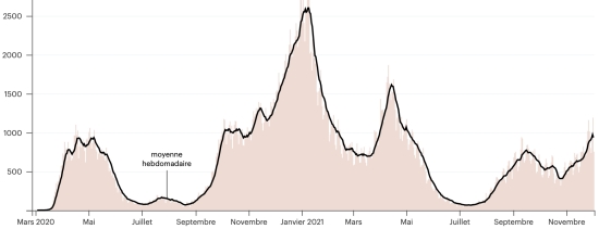 Test: 13,620,087 people tested since the first case (35,190 in 24 hours) Vaccination: 13,665,978 million doses of vaccine injected since December 16, 2020 date of the first injection (+26,563 in 24 hours), latest data available - MSSS dated December 2, 2021) FRANCE: * Cases confirmed since the first case (January 24, 2020): 7,773,530 cases (+48,416 cases in 24 hours), the day before (+ 49,610) * Healings: 7,141,173 healings (+3,757 in 24 hours), the day before (+12,507) National Healing Rate: 91.86% (-) Deaths: 119,330 deaths (+103 in 24 hours), the day before (+96) National death rate: 1.53% (-) * Active cases: (excluding death and recovery) 513,027 (+44,556 in 24h), the day before (+37,007) France: Number of daily confirmed cases: