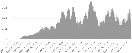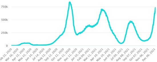 Test: 13,865,594 people tested since the first case (36,489 in 24 hours) Vaccination: 13,863,084 million doses of vaccine injected since December 16, 2020 date of the first injection (+33,799 in 24 hours), latest data available - MSSS dated December 9, 2021) FRANCE: * Cases confirmed since the first case (January 24, 2020): 8,105,785 cases (+ 56,854 cases in 24 hours), the day before (+ 61,340) * Healings: 7,252,376 healings (+20.951 in 24 hours), the day before (+20.194) National Healing Rate: 89.47% (-) Death: 120,168 deaths (+136 in 24 hours), the day before (+133) National death rate: 1.67% (+) * Active cases: (excluding death and cures) 733,241 (+35,767 in 24 hours), the day before (+41,013) France: Trend of active cases: (less healings and deaths)