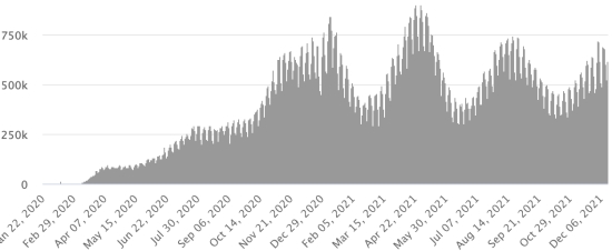 WORLD SITUATION: Epidemiological situation: On Wednesday, December 15, 2021, the number of people worldwide infected with the Covid-19 coronavirus and its variants since the start of the pandemic amounts to 271,781,704 cases (+620,245 in 24 hours), the day before ( +703,430) Number of contaminated countries: 221 * Healings: 244,375,126 people were cured of Covid-19 worldwide (+524,776 in 24 hours) the day before (+644,214) * Deaths: 5,337,994 people died of Covid-19 worldwide (+7,389 in 24 hours), the day before (+7,627) * Active cases (less deaths and recoveries) in the world is currently 22,068,584 cases (+88,080 in 24 hours), the day before (+51,589) Average cure rate in the world: 89.91% (-) Average death rate in the world: 1.96% (=) World: Number of daily confirmed cases:
