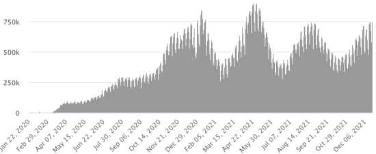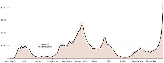 Test: 14,353,426, people tested since the first case (+43,912 in 24 hours) Vaccination: 14,435,353 million doses of vaccine injected since December 14, 2020 date of the first injection (+73,188 in 24 hours), latest data available - MSSS dated December 20, 2021) FRANCE: * Cases confirmed since the first case (January 24, 2020): 8,713,756 cases (+72,832 cases in 24 hours), the day before (+15,075) * Healings: 7,603,397 healings (+49,610), the day before (+46,878) National Healing Rate: 87.25% (-) Death: 121,927 deaths (+229 in 24 hours), the day before (+224) National death rate: 1.39% (-) * Active cases: (excluding death and cures) 988,413 (+22,993 in 24 hours), the day before (-32,027) France: Trend of active cases: (less healings and deaths)
