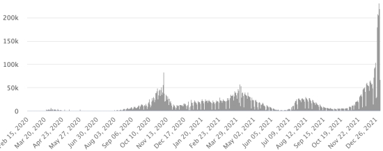 (January 1, 2022) Vaccination: 9.25 billion doses of vaccine injected (+40 million doses injected in 24 hours. Update January 3, 2022 (latest data available). HAITI: Epidemiological situation: According to the Ministry of Public Health, +217 new cases in 4 days of Covid-19 and its variants were confirmed in Haiti from December 26 to 30, 2021 (latest partial data available) for a total of 26,213 cases confirmed throughout the national territory (47.6% of women and 52.4% of men), since the first case (March 19, 2020 https://www.haitilibre.com/en/news-30319-haiti-health-origin-of-the-first-2-cases-of-covid-19-in-haiti.html ). Previous update (+13 cases on December 14 and 15, 2021). Heals: 23,405 (+99 in 4 days) Healing rate: 89.28% (+) Deaths: 773 deaths +8 in 4 days (West + 3, Center +5) Death rate: 2.94% (-) 4th wave: The total of the 4th wave (beginning of September 20, 2021) amounts to 4,630 confirmed cases and 123 deaths . Screening since the start of the pandemic: 152,951 tests (+1,287 in 4 days) since March 19, 2020, latest data available. Note that the very low number of people screened does not statistically make it possible to make a representative estimate of the situation in the country, which results in a low number of cases confirmed daily and a largely underestimated assessment. By comparison, the Dominican Republic has performed nearly 2.6 million tests on its population since the start of the epidemic. TOP 5 of the most affected municipalities in the West (2021): (from 15 to 30 December 2021) Delmas: 2.686 (+24); Pétion ville 2,083 (+34); Port-au-Prince 1,432 (+12); Tabarre 1,187 (+14); Croix-des-Bouquets 1,164 (+18) Confirmed cases by department (2021): West: 9.953 (2020: 6.945 cases) North: 673 cases (2020: 677 cases) Center: 1,020 cases (2020: 508 cases) Artibonitis: 857 cases (2020: 593 cases) Northeast: 405 cases (2020: 314 cases) Southeast: 766 cases (2020: 274 cases) South: 892 cases (2020: 262 cases) Northwest: 410 cases (2020: 229 cases) Grand'Anse: 861 cases (2020: 176 cases) Nippes: 249 cases (2020: 149 cases) Cumulative deaths by department (2021): West: 267 deaths (2020: 104 deaths) North: 53 deaths (2020: 34 deaths) Center: 62 deaths (2020: 13 deaths) Artibonitis: 36 deaths (2020: 39 deaths) Northeast: 6 deaths (2020: 6 deaths) South: 48 deaths (2020: 6 deaths) Southeast: 13 deaths (2020: 9 deaths) Northwest: 15 deaths (2020: 12 deaths) Grand'Anse: 7 deaths (2020: 13 deaths) Nippes: 25 deaths (2020: 5 deaths) Distribution of deaths by age (since the start of the epidemic): 0-9 years: 13 deaths 10-19 years: 10 deaths (+1) 20-29 years: 26 deaths 30-39 years: 48 deaths 40-49 years: 77 deaths 50-59 years: 125 deaths (+3) 60-69 years: 178 deaths (+2) 70-79 years: 170 deaths (+2) 80 years and over: 126 deaths Vaccination: 123,595 Haitians (1.06% of the population) have received a 1st dose of “Spikevax” vaccine from the MODERNA Laboratory since July 16, 2021, date of the first injection through 149 open vaccination centers https://www.haitilibre.com/en/news-35051-haiti-covid-19-list-of-149-vaccination-centers-open-in-the-country.html and 73,580 Haitians are fully vaccinated (2 doses, 0.63% of the population). Update 25 December 2021 latest information available (source MSPP) List of 149 vaccination centers open in Haiti (and hours) by department: (update 20 October 2021) DIASPORA: Epidemiological situation: USA: * Case since the first case (February 29, 2020): 57,131,187 cases (+989,012 in 24 hours), the day before (+277,656) * Healings: 41,722,468 healings (+179,408 in 24 hours), the day before (+24,588) National Healing Rate: 73.02% (-) * Death: 848,885 deaths (+1,477 in 24 hours), the day before (+246) National death rate: 1.48% (-) * Active cases (less deaths and recoveries): 14,559,834 (+808,127 in 24 hours), the day before (+252,822) Tests: 813,825,574 last available data. USA: Number of daily confirmed cases