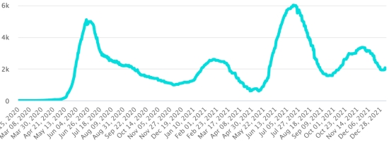 (Day-1) Vaccination: 516.6 million doses of vaccine injected since December 14, 2020, date of the first injection in the United States (1.44 million doses injected in 24 hours. Update January 7, 2022 ( latest available data). DOMINICAN REPUBLIC: Cases confirmed since March 1, 2020: 444,985 cases (+5,968 in 24 hours) the day before (+5,307). First case (March 1, 2020) Healings: 411,653 healings (+2,078), the day before () National Healing Rate: 92.50% (-) Death: 4,253 deaths (+1 in 24 hours), the day before (+0) Death rate: 0.95% (-) Positivity rate over 4 epidemiological weeks: 18.1% (+) Active cases: (excluding death and recovery) 29,079 cases (+3,889) the day before () Dominican Republic: Trend of active cases: (less healings and deaths)