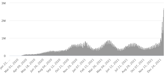 WORLD SITUATION: Epidemiological situation: On Saturday January 8, 2022, the number of people worldwide infected with the Covid-19 coronavirus and its variants since the start of the pandemic amounts to 303,931,140 cases (+2,994,099 in 24 hours), the day before ( +2,601,097). Number of contaminated countries: 221 * Healings: 258,380,260 people were cured of Covid-19 worldwide (+738,671 in 24 hours), the day before (+758,128) * Deaths: 5,498,982 people died from Covid-19 worldwide (+7,533 in 24 hours), the day before (+8,725) * Active cases (less deaths and recoveries) in the world is currently 40,051,898 cases (+2,247,895 in 24 hours), the day before (+1,834,244) Average cure rate in the world: 85.01% (-) Average death rate in the world: 1.80% (-) World: Number of daily confirmed cases: