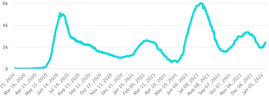 Vaccination: 9.63 billion doses of vaccine injected (+30 million doses injected in 24 hours. Updated January 14, 2022 (latest data available). HAITI: Epidemiological situation: According to the Ministry of Public Health, +236 new cases in 24 hours of Covid-19 and its variants were confirmed in Haiti on January 10, 2022 (latest partial data available ) for a total of 27,318 confirmed cases throughout the national territory (48.1% women and 51.9% men), since the first case (March 19, 2020 https://www.haitilibre.com/en/news-30319-haiti-health-origin-of-the-first-2-cases-of-covid-19-in-haiti.html ). Previous update (+82 cases on January 9, 2022). Healings: 23,927 (+36 in 24h) Cure rate: 87.58% (-) Deaths: 780 deaths +0 since January 7, 2022 (last info available) Death rate: 2.85% (-) 5th wave (dominant omicron): Total of the 5th wave (beginning December 27, 2021) amounts to 1,323 confirmed cases and 14 deaths Haiti: Active Cases Trend: (less recoveries and deaths)