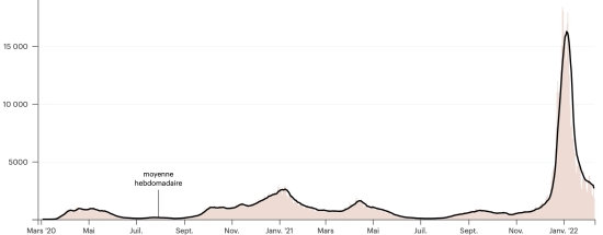 Test: 16,347,051 people tested since the first case (+23,135 in 24 hours) Vaccination: 18,061,383 doses of vaccine injected since December 14, 2020, date of the first injection (+35,044 doses in 24 hours), latest data available - MSSS as of February 9, 2022) FRANCE: Warning: Santé publique France did not update the data for Wednesday, February 9. The figures below are therefore the latest available (Tuesday 8 February 2022). *Confirmed cases since the first case (January 24, 2020): 21,039,639 cases (+ 235,267 cases in 24 hours), the day before (235,267) *Healings: 15,042,541 healings (+435,750 in 24h), previous (+435,750) National Cure Rate: 71.49% (+) Deaths: 133,614 deaths (+691 in 24 hours), the day before (+691) Death rate: 0.63% (=) Active Cases: 5,863,484 (-201,174 in 24h), the day before (-201,174) Test: 238,632,994 (last data available February 8, 2022) France: Trend of active cases: (minus recoveries and deaths)