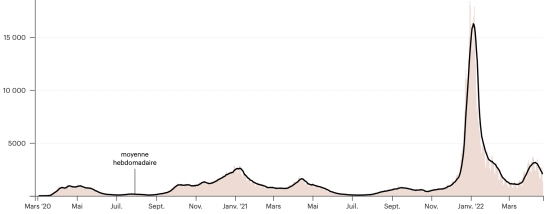(average weekly trend) Vaccination: 19,257,081 doses of vaccine injected since December 14, 2020, date of the first injection (+40,388 doses in 24 hours), latest data available - MSSS as of April 20, 2022) FRANCE: *Confirmed cases since the first case (January 24, 2020): 28,303,931 cases (+58,954 cases in 24 hours), the day before (+80,571) *Healings: 25,880,440 healings (+27,608), the day before (+102,191) National Cure Rate: 91.43% (+) Deaths: 145,060 deaths (+40 in 24 hours), the day before (+75) Death rate: 0.51% (=) Active cases: 2,278,431 (+31,306 in 24 hours), the day before (-21,695) France: Number of daily confirmed cases: