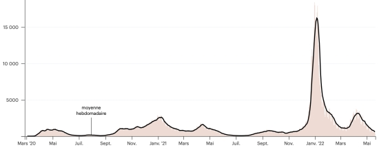 (average weekly trend) Vaccination: 19,824,501 doses of vaccine injected since December 14, 2020, date of the first injection (+12,640 doses in 24 hours), latest data available - MSSS) FRANCE: *Confirmed cases since the first case (January 24, 2020): 29,337,985 cases (+22,507 cases in 24 hours), the day before (+24,332) *Healings: 28,534,231 healings (+36,726 in 24 hours), the day before (+49,417) National Cure Rate: 97.26% (+) Deaths: 147,780 deaths (not available), the day before (+65 in 48 hours) Death rate: 0.50% (=) Active Cases: 655,974 (-14,219 in 24 hours), the day before (-25,150) France: Number of daily confirmed cases: