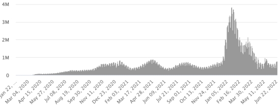 GLOBAL SITUATION 2019-2022: Epidemiological situation: Saturday June 25, 2022 the number of people infected worldwide with the Covid-19 coronavirus and its variants since the start of the pandemic (March 11, 2020) amounts to 548,295,624 cases (+789,958 in 24h), the day before (+790,974) Number of infected countries: 228 *Healings: 523,289,337 people have been cured of Covid-19 worldwide (+448,085 in 24 hours), the day before (+477,774) *Deaths: 6,349,682 people have died of Covid-19 worldwide since the start of the pandemic (+1,784 in 24 hours), the day before (+1,909) *Active cases (minus deaths and recoveries) in the world is currently 18,656,605 cases (+340,089 in 24 hours), the day before (+311,291) Cure rate in the world: 95.43% (-) Death rate in the world: 1.15% (-) World: Trend of confirmed daily cases