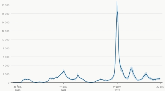 TOP 5 Provinces with the most new cases: (latest data available) Distrito Nacional: +10 new cases in 24 hours (+) Santo Domingo: +6 new cases in 24 hours (+) Santiago: +5 new cases in 24 hours (-) Valverde: +3 new cases in 24 hours (+) Puerto Plata: +2 new cases in 24 hours (+) Vaccination: 16.07 million doses of vaccine injected since February 16, 2021, date of the first injection in the Dominican Republic (+10,000 doses). (Latest data available). QUEBEC: Confirmed cases since the first case (February 27, 2020): 1,219,923 cases (+903 in 24 hours), previous (+1,057 in 24 hours) Deaths: 16,940 deaths (+15 in 24h) previous (+10 in 24h) Death rate: 1.38% (=) Healing: The Center for Expertise and Reference in Public Health no longer makes this information available. Quebec: Number of daily confirmed cases: (7-day trend)