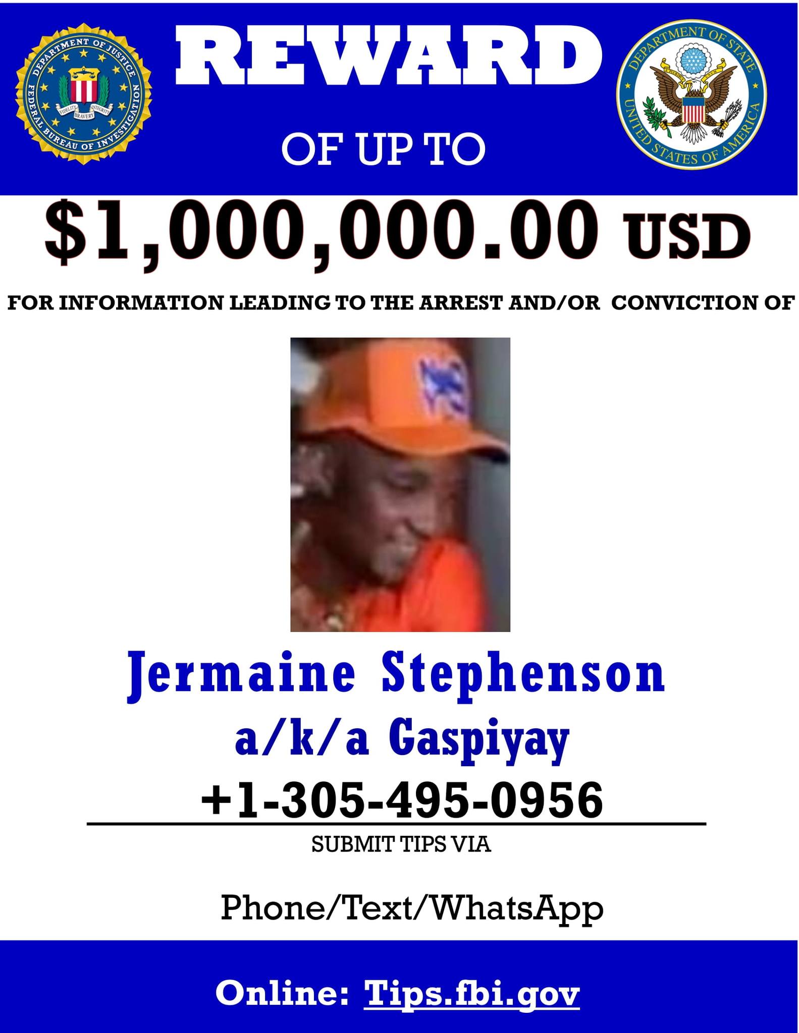 The U.S. Department of State is offering a REWARD OF UP TO $1 MILLION for information leading to the arrest and/or conviction of Jermaine Stephenson, a/k/a Gaspiyay, Gaspielle, Jermaine Steevenson, Ibberson. If you have information, please contact the U.S. Federal Bureau of Investigation at +1-305-495-0956 (Text/WhatsApp) or online at Tips.fbi.gov. If you are located outside of the United States, you may also visit the nearest U.S. Embassy or Consulate. If in the United States, you can also contact the local FBI office in your city. ALL IDENTITIES of the INFORMANTS ARE KEPT STRICTLY CONFIDENTIAL. Government officials and employees are not eligible for rewards. *** To follow tomorrow the sheet of Vitel'Homme-Innocent Infos of Joseph Wilson file alias "Lanmò Sanjou": https://www.haitilibre.com/en/news-38106-haiti-usa-infos-of-joseph-wilson-alias-lanmo-sanjou-how-to-submit-your-information.html See also : HL/ HaitiLibre