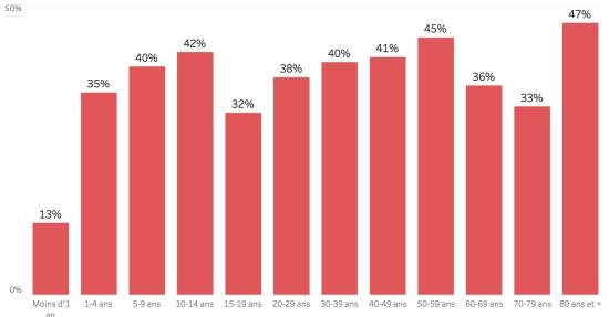 Distribution and deviations of suspected cases, total since October 3 (in 48 hours): Less than 1 year: +255 (+6) 1-4 years: 2,150 cases (-124) 5-9 years: 1,577 cases (-56) 10-14 years: 758 cases (-1) 15-19 years old: 561 cases (-13) 20-29 years old: 1,704 cases (-25) 30-39 years old: 1,683 cases (-26) 40-49 years old: 1,140 cases (-26) 50-59 years old: 766 cases (-3) 60-69 years old: 452 cases (-15) 70-79 years: 224 cases (-4) 80 and + () case () Men: 58.73% men (-); Women 41.27% (+) Positivity rate by age segment: