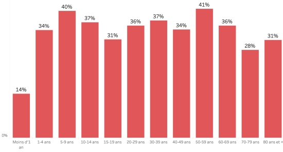 Distribution and deviations of suspected cases, total since October 3: Less than 1 year: + 578 (+8) 1-4 years: 6,241 cases (+38) 5-9 years: 4,601 cases (+32) 10-14 years old: 2,191 cases (+24) 15-19 years old: 1,612 cases (+14) 20-29 years old: 4,238 cases (+25) 30-39 years old: 3,736 cases (+23) 40-49 years old: 2,674 cases (+25) 50-59 years old: 2,007 cases (+16) 60-69 years old: 1,332 cases (+19) 70-79 years old: 724 cases (+10) 80 years and over: 98 cases cases (not available) Men: 55.81% men (-); Women 44.19% (+) Positivity rate by age segment: