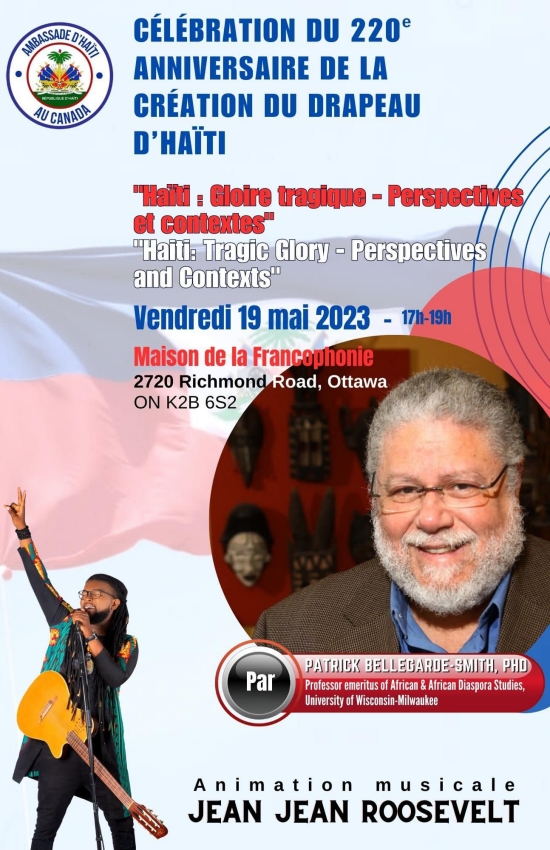 The Embassy of Haiti in Canada is pleased to invite you to a lecture by Professor Patrick Bellegarde-Smith, on the occasion of the 220th anniversary of the creation of the flag of Haiti, on Friday May 19, 2023, at 5:00 p.m., at the Maison de la Francophonie located at 2720 Richmond Street, Ottawa, ON K2B 6S2. Theme: "Haiti: Tragic Glory - Perspectives and Contexts" Musical entertainment: Jean Jean Roosevelt The seats are limited. Please reserve your presence: https://www.eventbrite.com/e/billets-celebration-du-220e-anniversary-de-la-creation-du-drapeau-haitien-624565079967 Learn more about Patrick Bellegarde-Smith: Patrick Bellegarde-Smith is a professor emeritus of Africology at the University of Wisconsin-Milwaukee. He obtained a Ph.D. from The American University in international studies and taught in that field. Later, he taught courses in both African-American and Women’s Studies. His scholarship presently is in the areas of African and neo-African religious thought and social philosophy, with an emphasis on national and cultural identities. Bellegarde-Smith has authored, edited and co-edited five books on these subjects, and a large number of articles, notably In The Shadows of Power: Dantes Bellegarde in Haitian Social Thought; Haiti: The Breached Citadel, and Fragments of Bone: Neo-African Religions in the New World. Some of this work has been translated into Spanish, Portuguese, and French. Bellegarde-Smith is the recipient of the Medaille Jean Price-Mars, Universite d’Etat d’Haiti, and of the Lifetime Achievement Award for Scholarship from the Haitian Studies Association. Currently, he is the President of the Congress of Santa Barbara (KOSANBA), a scholarly association for the study of Haitian Vodou, and the Vice-President (and President-elect) of the Haitian Studies Association. Additionally, he is an associate editor of the Journal of Haitian Studies, a member of the international editorial board of Kalfou: A journal of Comparative and Relational Ethnic Studies, and a member of the editorial board of the Journal of Africana Religions. Also, Bellegarde-Smith is a oungan asogwe, a priest of Vodou.
