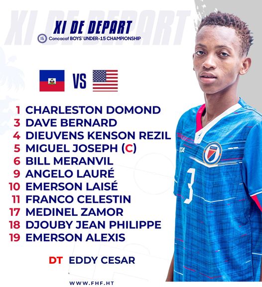 Friday August 11, 2023 in the 1/2 final of the U-15 Men's Championship of the Confederation of North America, Central America and the Caribbean (CONCACAF) our young Grenadiers (league A), faced the "Yanks" of the United States on the lawn of the Olympic Stadium Felix Sanchez, in Santo Domingo in the Dominican Republic This match for Haiti had a taste of revenge after the defeat [3-0] against the United States on the wet ground of the San Cristóbal Pan American Stadium in the Dominican Republic https://www.haitilibre.com/en/news-40211-haiti-flash-humiliated-by-the-usa-[3-0]-haiti-remains-qualified-for-the-1-4-finals.html Despite all their efforts, our little grenadiers who made life difficult for the Americans lost in the semi-final [1-0] face the "Yanks" who narrowly qualified for the final. Facing Haiti for the second time in this competition https://www.haitilibre.com/en/news-40211-haiti-flash-humiliated-by-the-usa-[3-0]-haiti-remains-qualified-for-the-1-4-finals.html the United States went through a difficult first half against our valiant grenadiers. At the end of the first period remained draw [0-0] Back from the locker room, a goal from a free kick at the start of the period from a header by Sebastian Chavez opened the scoring in favor of the United States [0-1]. Despite the efforts of our Grenadiers and some unrealized chances, Haiti was unable to find equality due to a strong American defense which was able to keep Haiti at distance. At the end of the match, the United States narrowly qualified for the final of the Championship [1-0] against one of their most dangerous opponents. Our Grenadiers, who have not been unworthy, will play the classification match against Jamaica on Sunday August 13. (which lost 3-0 to Mexico) Starting 11: For this meeting against the United States in the semi-finals, coach Eddy César renewed the same players who won against Canada [1-0] https://www.haitilibre.com/en/news-40227-haiti-flash-our-grenadiers-winners-against-canada-[1-0]-are-qualified-for-the-semi-final.html