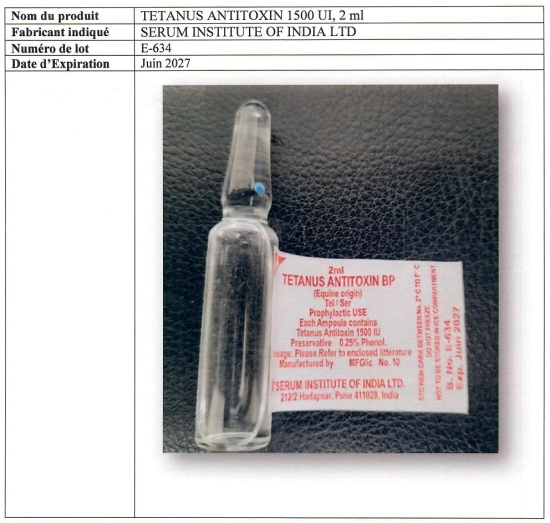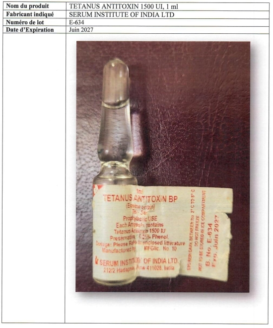 The primary packaging is written in English and indicates a batch number E-634 which has no traceability in Haiti. The expiration date (06/2027) is mentioned on the label of the 1ml and 2ml ampoules. In terms of risks, the use of the falsified "Tetanus antitoxin 1500 IU, 1 and 2 ml" induces ineffective treatment and other more serious risks to the patient's health, even putting their life in danger. Furthermore, in order to protect the health of the population, the MSPP calls for vigilance. The purchase, distribution, sale and use of any product meeting these characteristics are strictly prohibited on Haitian territory. The MSPP therefore urges all health professionals to report any incident relating to pharmacovigilance to the Health Directorate of their respective jurisdiction for immediate appropriate action. S/ HaitiLibre