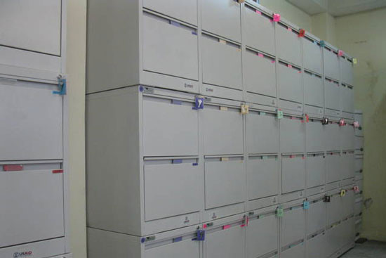 Work is progressing and in the archive room, many documents have already been sorted and classified either in boxes or in drawers. This is a provisional classification where each box is codified, it bears in this way the code of the court and the judge. A color is assigned to each judge who also has his drawer on which it can find its color and code.