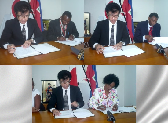 Wednesday, Kentaro Minami, Ambassador of Japan accredited in Haiti has signed 3 projects (ODPSA-UNICC-PROFAMIL) for a value of over 300,000 U.S. dollars in the fields of agriculture, education and health. Was present at the signing session Elo Belizaire Coordinator of the Organization for the Development of the Peasants of Salmadère (ODPSA), Violette Pierre-Louis, Coordinator of the Union of Concerned Christians, of the NGO INICC for the education project and Dr. Gadner Michaud Executive Director of the NGO PROFAMIL for the health project. ODPSA : (89,596 dollars) The Organization for the Development of the Peasants of Salmadère (ODPSA) is a peasant nonprofit organization, which, since 2004, is engaged in the development of the municipality of Thomonde through processing activities of maize and millet and soil improvement techniques to increase productivity. The "Project of Construction and Equipment of the processing plant of Peanut in Salmadère" funded to the tune of 89.596 U.S. dollars, includes: