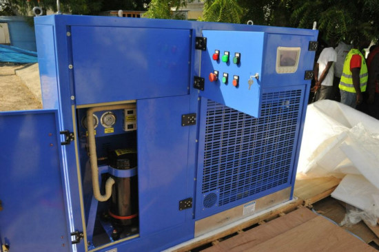 Learn more about the Atmospheric Water Generators : An atmospheric water generator (AWG), is a device that extracts water from humid ambient air. Water vapor in the air is condensed by cooling the air below its dew point, exposing the air to desiccants, or pressurizing the air. Unlike a dehumidifier, an AWG is designed to render the water potable. AWGs are very useful in locations where pure drinking water is difficult or impossible to obtain, as there is almost always a small amount of water in the air. The two primary techniques in use are cooling and desiccants. Many atmospheric water generators operate in a manner very similar to that of a dehumidifier: air is passed over a cooled coil, causing water to condense. The rate of water production depends on the ambient temperature, humidity, the volume of air passing over the coil, and the machine's capacity to cool the coil. These systems reduce air temperature, which in turn reduces the air's capacity to carry water vapor. This is the most common technology. Atmospheric water generators become more effective as relative humidity and air temperature increase. The rate at which water can be produced depends on relative humidity and ambient air temperature and size of the compressor. The cost-effectiveness of an atmospheric water generator depends on the capacity of the machine, local humidity and temperature conditions and the cost to power the unit. SL/ HaitiLibre