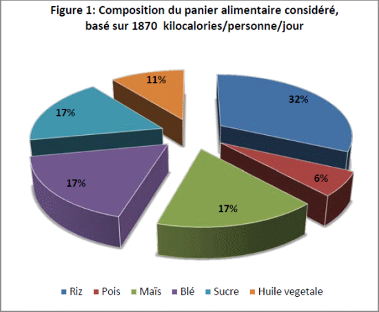 The food basket prepared by the office of the National Coordination of Food Security and the Ministry of Agriculture, Natural Resources and Rural Development (CNSA/MARNDR) is composed of products that reflect the food preferences of individuals or households. It is composed : of cereals (rice, maize, wheat) represent 66% (1000 kcal) of the basket, of beans, of sugar and cooking oil (Figure 1). Of a caloric intake of nearly 32% (over 500 kcal), rice is the food most representative. Other cereals (maize, wheat) and sugar, each make 17%. Fats and peas are poorly represented (only 11 and 6% respectively).