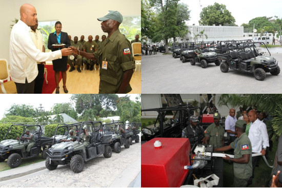 The President Michel Martelly, proceeded, Wednesday, July 25, at the National Palace, to the delivery of 21 all-terrain vehicles (ATV) Polaris Ranger, worth 380.000 dollars, to the Environmental Monitoring Body (CSE). The ceremony took place in presence of members of the Government, the Representative of the Secretary General of the United Nations, representatives of the diplomatic corps, international organizations, Parliamentarians and actors working in the environmental field. Dieunord Joseph, spokesperson of the beneficiaries, thanked, on behalf of the CSE, the Head of State for his involvement alongside this entity and said that he relies on his support for the strengthening of body in its actions in favor of environmental protection. Ronald Toussaint Joseph, the Environment Minister, has shown its commitment to work towards the improvement of the environmental system of Haiti and gave assurances of an efficient use of these vehicles. He also took the opportunity to present some achievements of his Ministry and promised to the President to work more to stay on the path of progress.