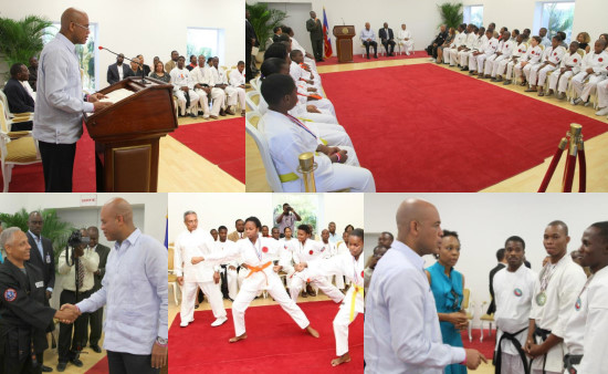 In his speech, the Shian Henri-Robert Abélard, commended the President Martelly, for having invited and honored in a big way the Haitian delegation of karate victorious and thanked the Government and the Presidency for their support. Recalling that "The defeat makes unfortunately much more din in this country [...] but, today, thanks to you, the din of the victory taken over the din of the defeat." The President of the Republic took this opportunity to renew its support for national sports initiatives, including the 25th International Martial Arts Championship to be held next year in Haiti and promised not to miss any opportunity to pay tribute to Haitian compatriots that honor the country abroad. HL/ BF/ HaitiLibre