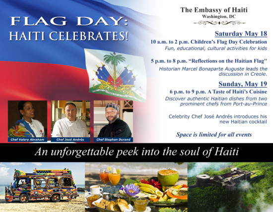 Two weeks of events for children, History buffs and food Lovers start May 18 to celebrate the 210th flag day. A celebration of history and independence of the nation which is much more than our two-tone "Our flag is a symbol of the country’s revolution and freedom," declared Paul G. Altidor, Haiti’s ambassador to the United States. To celebrate Flag Day, which falls on Saturday, May 18, 2013, the Embassy offers a series of events to showcase Haiti’s history and culture. The activities begin at the Embassy, includes a special dining event at the World Bank and wraps up with a Haitian dish on the menu at two top local restaurants, Jaleo and Oyamel. "We want to share the best parts of Haiti," declared Ambassador Altidor, who along with a team from the Embassy chose the participating chefs after reviewing nominations. "Our food and our flag are integral parts of our culture." Space is limited for each event, so people are encouraged to register early : Kids. The festivities kick off with an event for children at the Embassy. From storytelling to crafts, young people are invited to learn about the flag, the language and the history. Saturday, May 18 from 10 a.m. to 2 p.m. tasteofhaiti.eventbrite.com