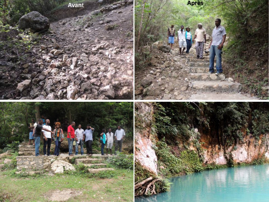 Development project of Bassin Bleu A meeting between the Town Hall of Jacmel, the Departmental Directorates of Tourism and Environment Southeast and representatives of the Caribbean Biological Corridor: CBC/Welthungerhife was organized to create a synergy between the partners involved in the development of the natural site of Bassin Bleu, located in Jacmel in the rural section Lavanneau and schedule project activities. On Tuesday, a site visit was conducted by Ms. Dithny Joan Raton, Director of Tourism South East to see the progress of works relating to the cleaning of the site, cleaning of basins, trail improvements, creating discovery trails around biodiversity.
